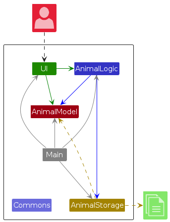 Generally, the UI consists of the command box for the user to input commands, a result display to give an output based on the command given, and a main animal display panel consisting of 2 parts: